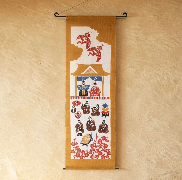五人囃子が太鼓を叩く、笛を吹く 鶴亀も加わって賑やかなひな祭り。 こちらの型染め雛タペストリーは 画像でみるより 実物がとにかくすばらしい逸品です なかなか探しても出会えない作品だと思い 手元にお店のディスプレイ用にと 販売とは別に私達も注文いたしました。 シンプルで飽きがこない 大人のお雛様タペストリー。 毎年飾れますし、お子様や、お孫さんの 記念の一品にぜひ 一生お使いいただける おすすめの雛飾りです。 和にも洋にもなじみやすいデザインで マンションなど床の間でなくとも 壁に掛けやすいサイズです。 技法:型染 サイズ: W 44 cm H 135 cm 重さ:約980g 素材:麻 100 % 付属品:上下軸棒(鉄製)、紐 ※一つ一つ手作りですので大きさ、色合い、形には多少の違いがありますことを予めご了承の上、ご購入を検討ください。 ※箱にお入れして納品致します。