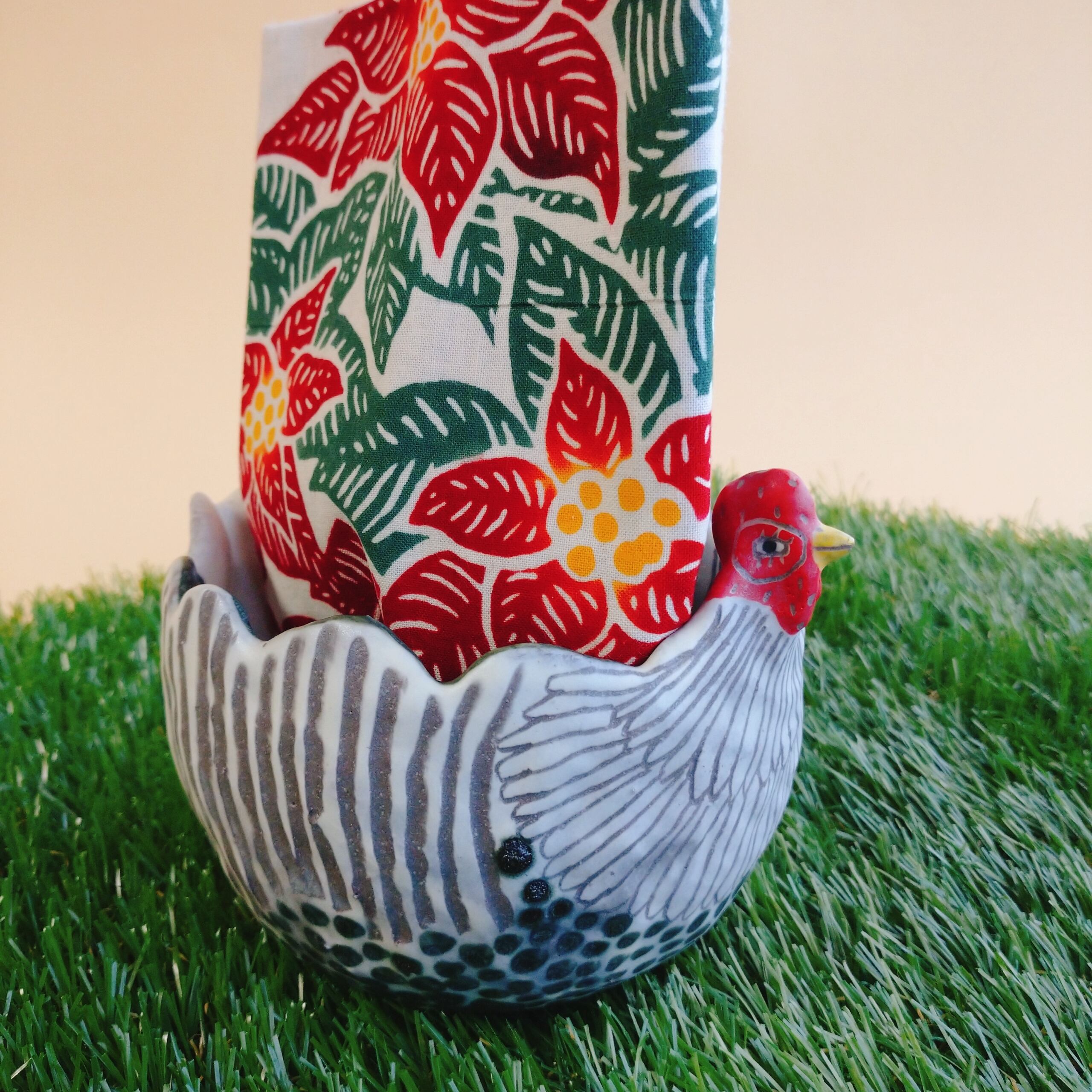 ニワトリの形を象った入れ物。小物や料理などを入れることができます。