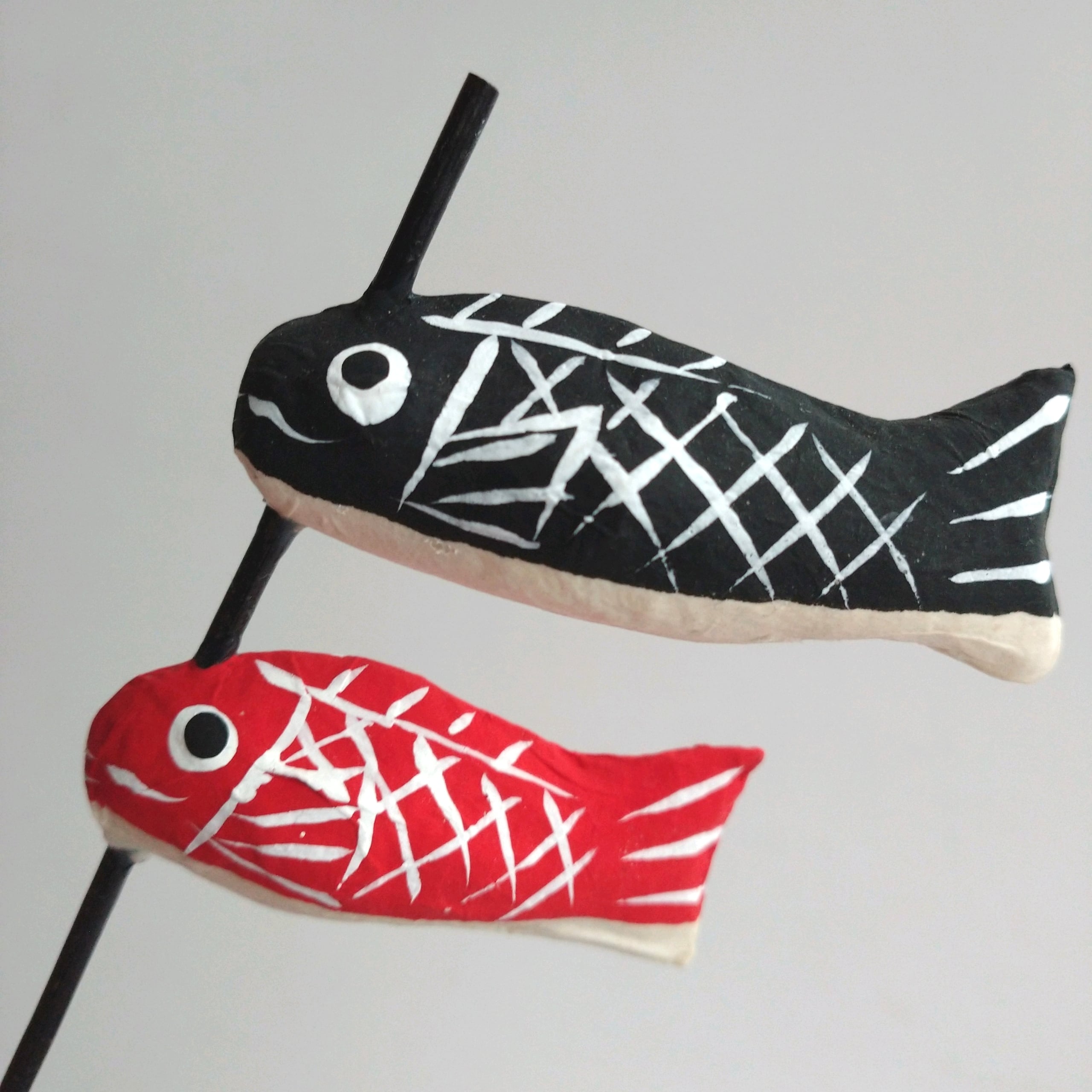 張り子でできた五月人形。鯛、金太郎、鯉のぼりといった端午の節句を代表するものが一つになった可愛らしい人形です。