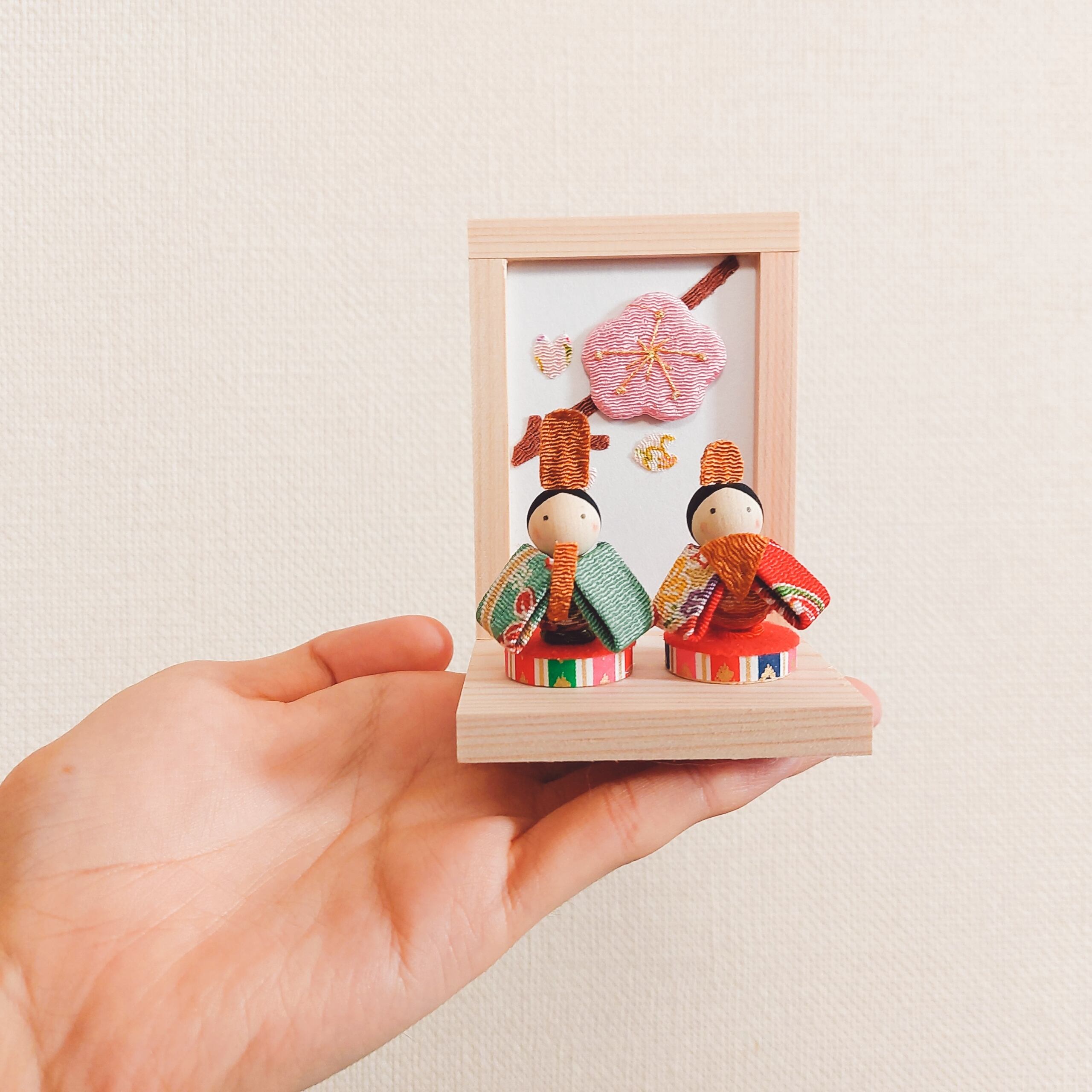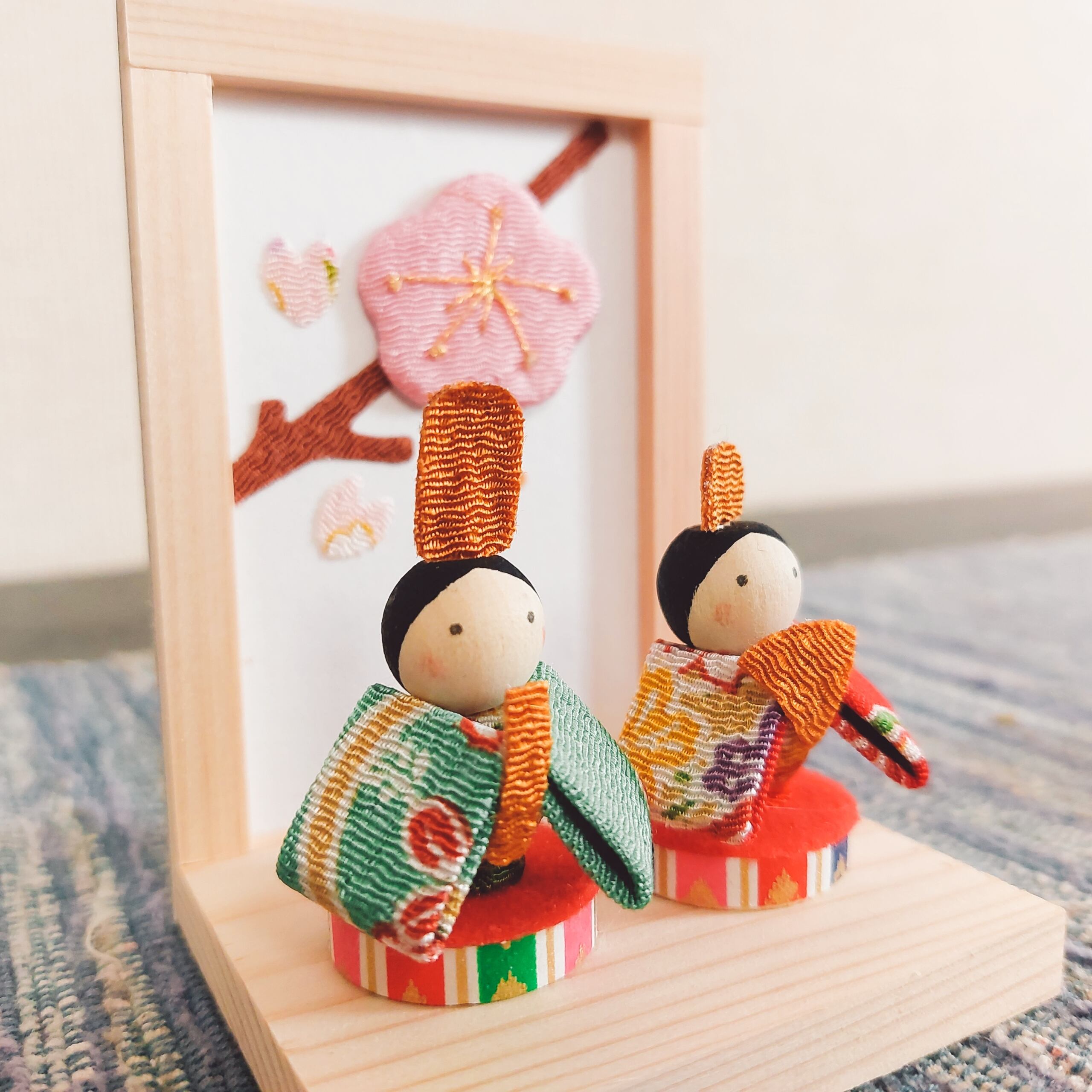 コンパクトサイズのお雛様飾り。色彩豊かなちりめん生地と和やかな表情が特徴。ちりめん製のぼんぼり飾りと、和紙を張った木製の台座が付属。台座と人形は固定されています。