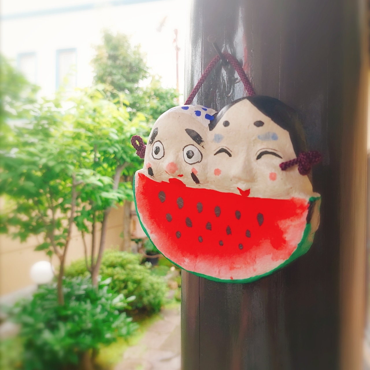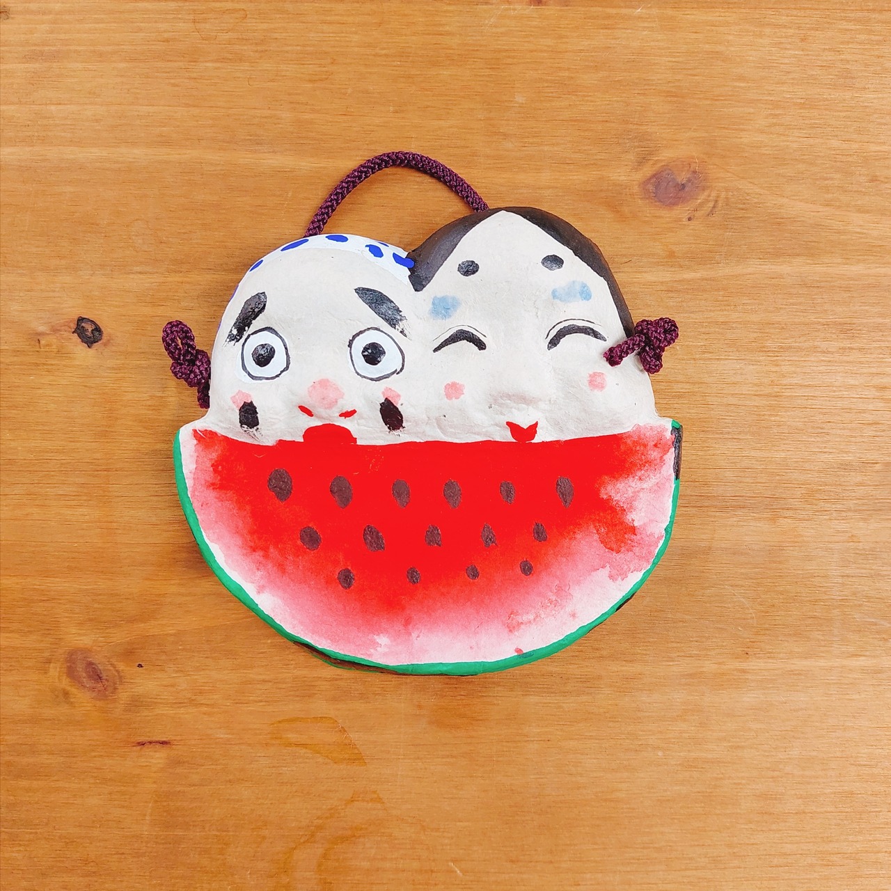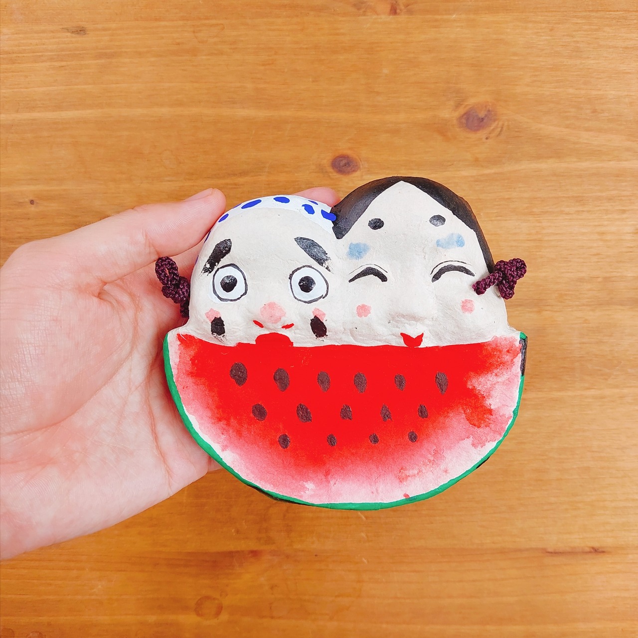 ひょっとことおかめがスイカを食べているお面です。和紙製。