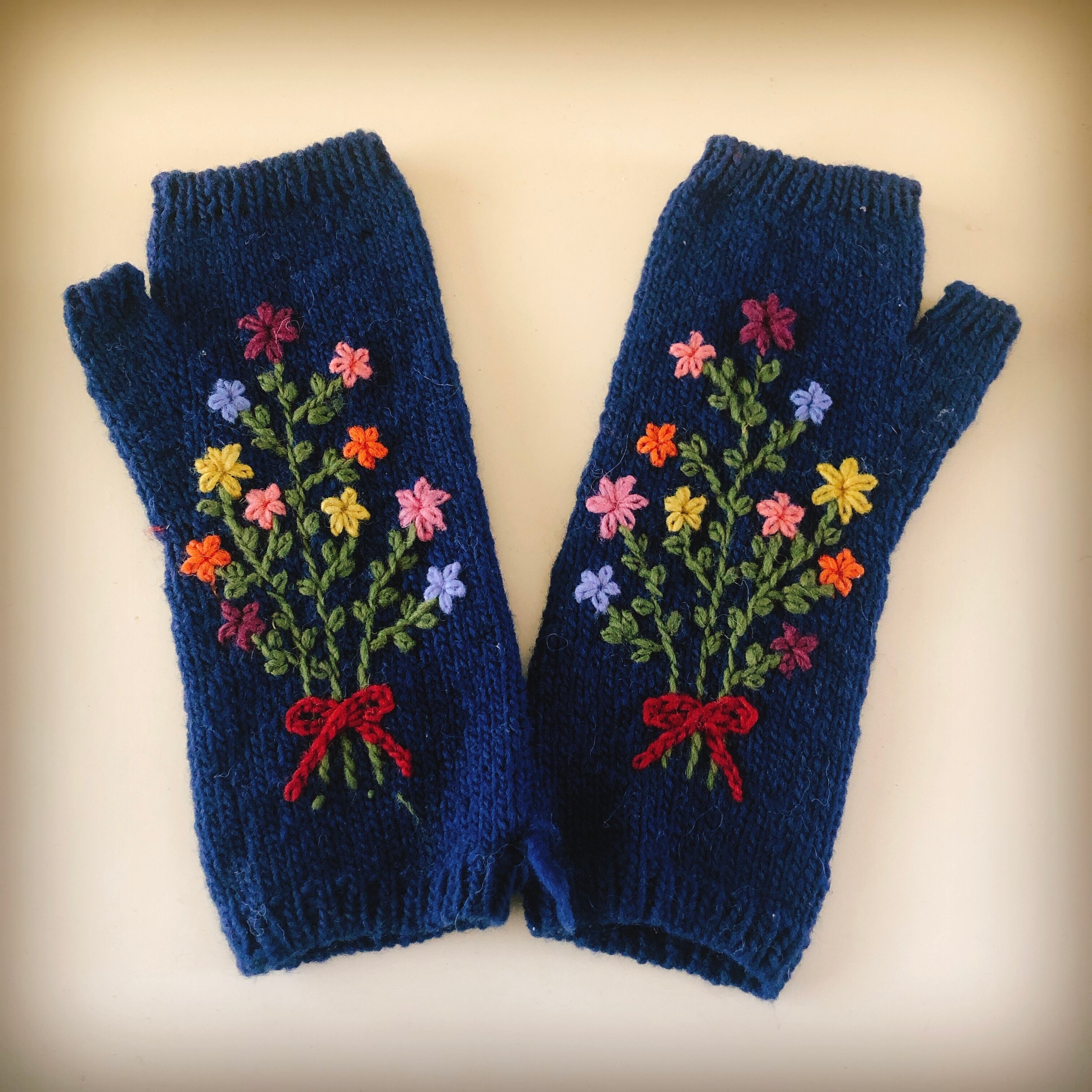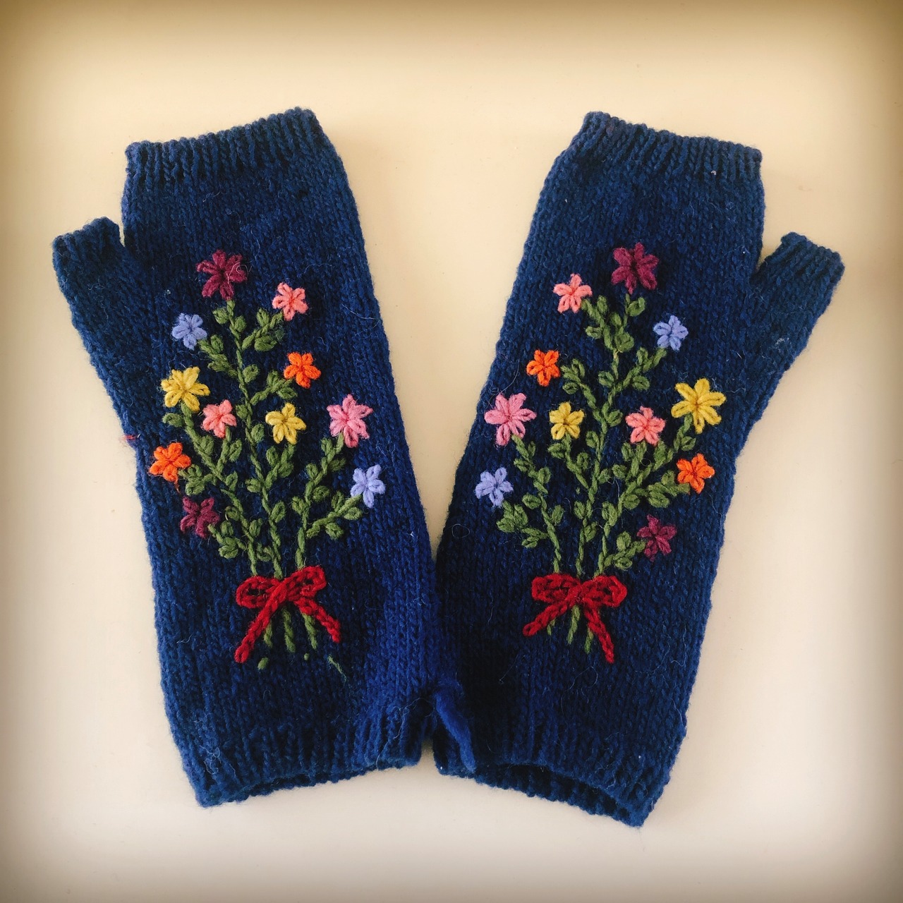 手袋 ウール 花刺繍 ゆびなし 紺色